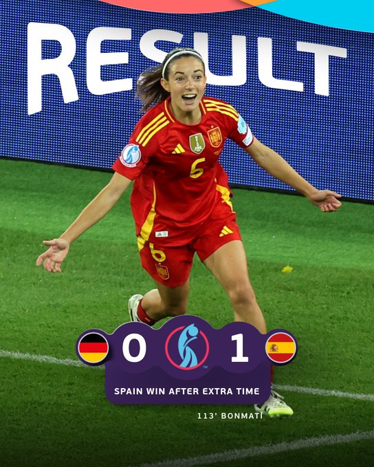 യൂറോ 2025 വനിതാ ചാംപ്യന്‍ഷിപ്പില്‍ സ്പെയിൻ ഫൈനലിൽ. ആവേശകരമായ സെമിഫൈനലിൽ ജർമനിയെ ഏകപക്ഷീയമായ ഒരു ഗോളിന് വീഴ്ത്തിയാണ് സ്പെയിൻ തങ്ങളുടെ ആദ്യ വനിതാ യൂറോ ഫൈനലിൽ പ്രവേശിച്ചത്. എക്സ്ട്രാ ടൈമിൽ സൂപ്പർ താരം ഐറ്റാന ബോൺമാറ്റിയാണ് വിജയഗോൾ നേടിയത്.